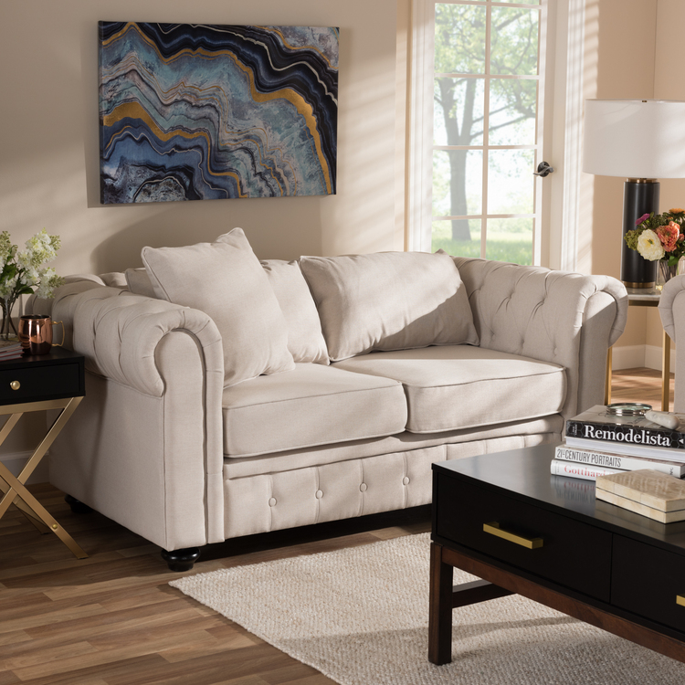 • Baxton Studio Alaise Modern Classic Beige Linen Tufted Scroll Arm Chesterfield Loveseat image - 1