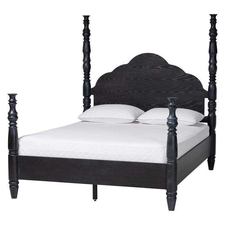 • Baxton Studio Martino Four-Poster Platform Bed - Sculpted Post Bed Frame with Panel Headboard, Vintage Spindle Bed, Black, King image - 1