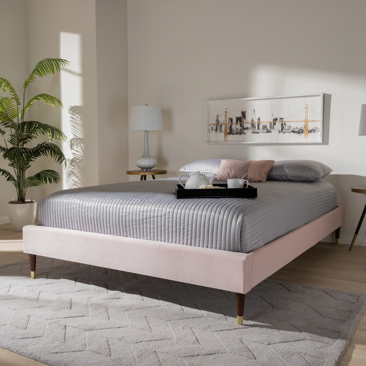 Glam Gold - Tone Wood Platform Bed Frame Light Pink Velvet Upholstered Full Size - WholeSale Interiors