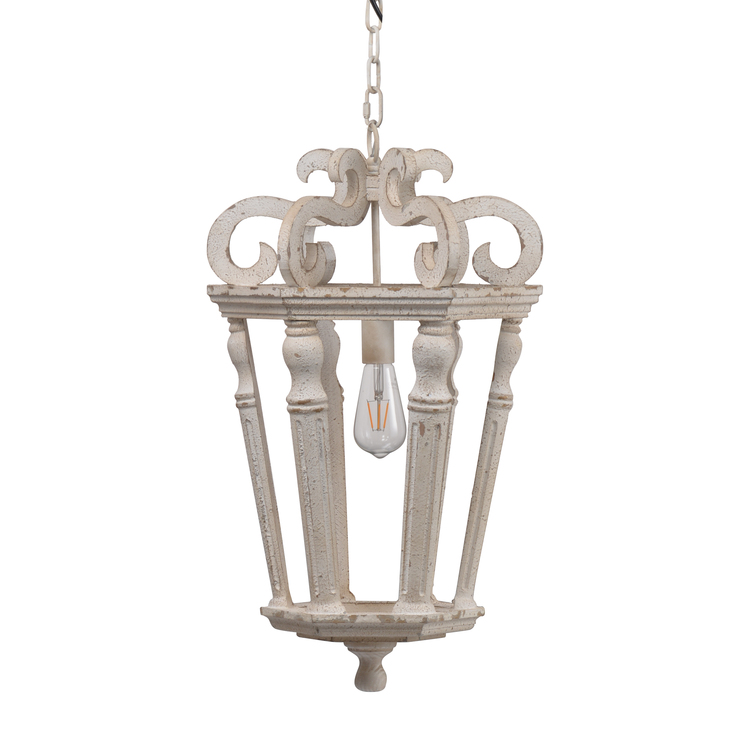 • Benjara 16 Inch Wood Chandelier, Carved Design, Single Bulb, Classic, Vintage White image - 1