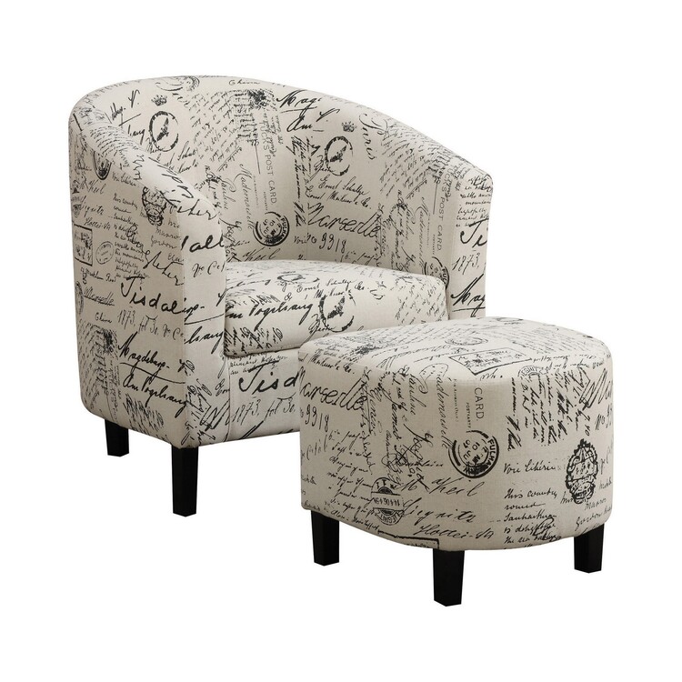 • Benjara 30 Inch Barrel Accent Chair with Half Oval Ottoman, Off White French Script image - 1