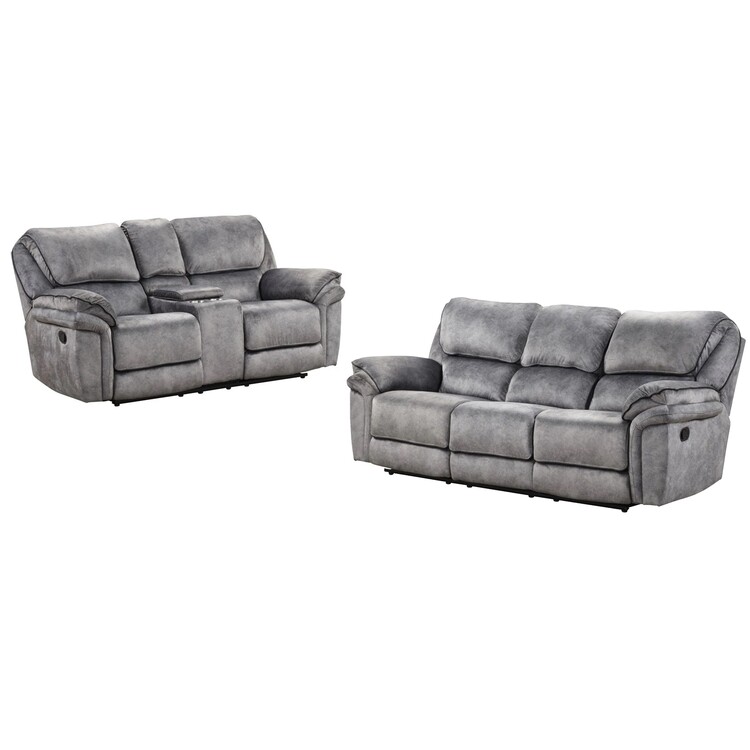 • Benjara Arisa Sofa and Loveseat Manual Recliner Set, Gray Faux Leather, Drop Table image - 1