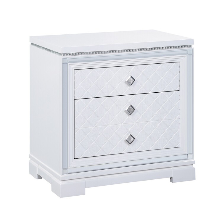 • Benjara Axl 29 Inch 2 Drawer Nightstand, USB Ports, Embossed, Mirror Trim, White image - 1