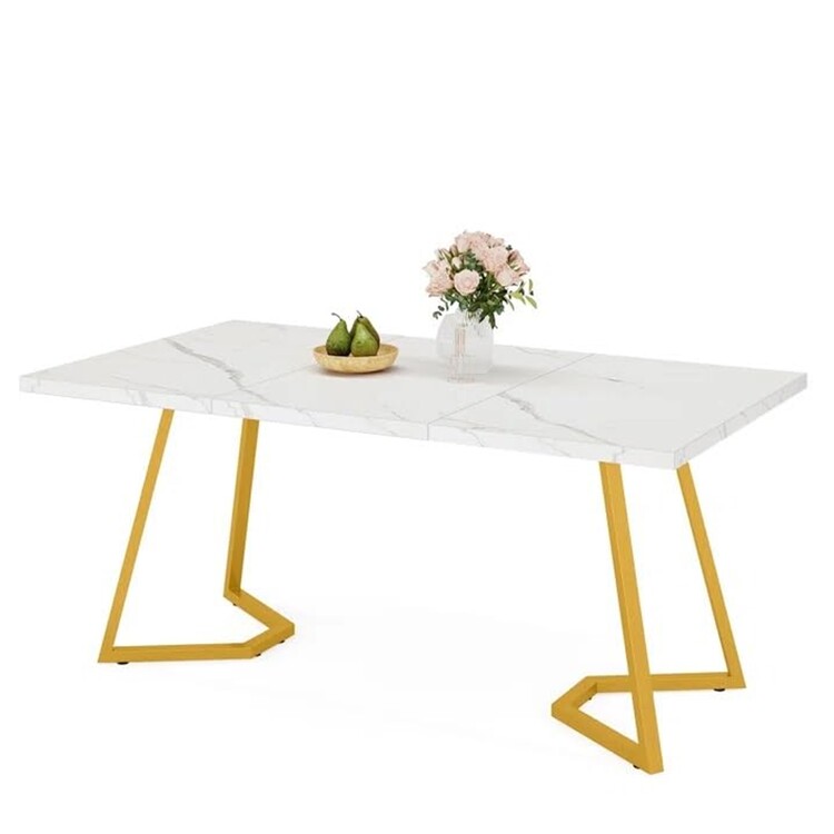 • Benjara Computer Office Desk, 55 Inch Painted Gold Metal, White Faux Marble image - 1