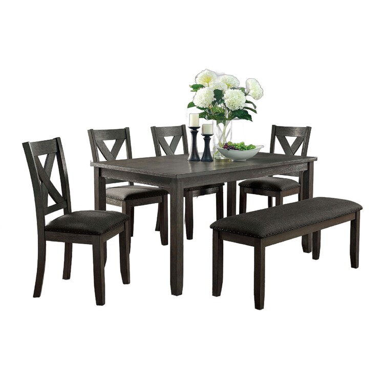 BenJara Garie 6pc Dining Table Set with Bench, 4 X-Cross Back Chair, Gray Wood