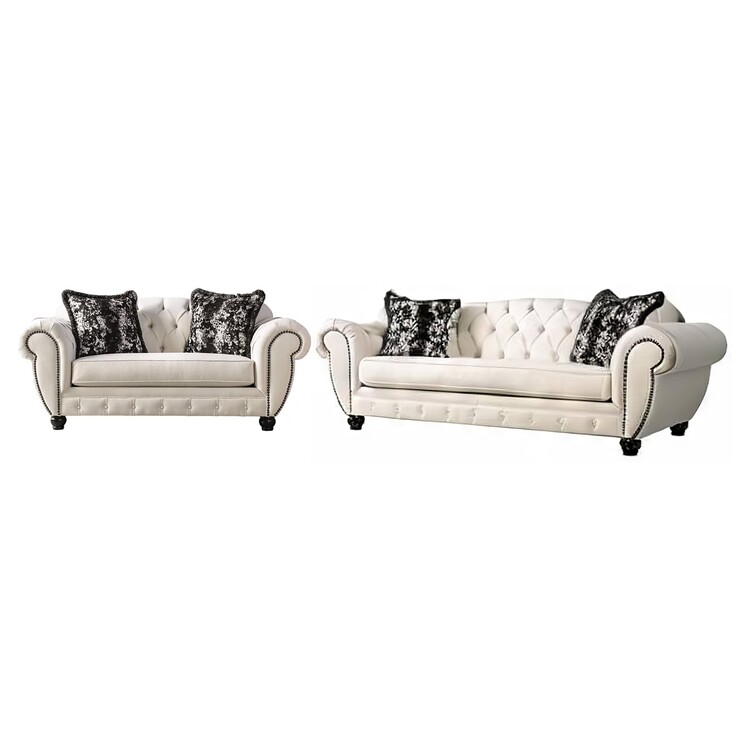 BenJara Ilda Sofa Loveseat Set, Chesterfield Design, Beige Tufted Faux Linen