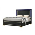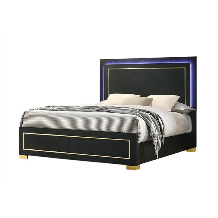 • Benjara Lati Queen Bed, LED Headboard, Gold Trim and Bracket Legs, Black Wood image - 1