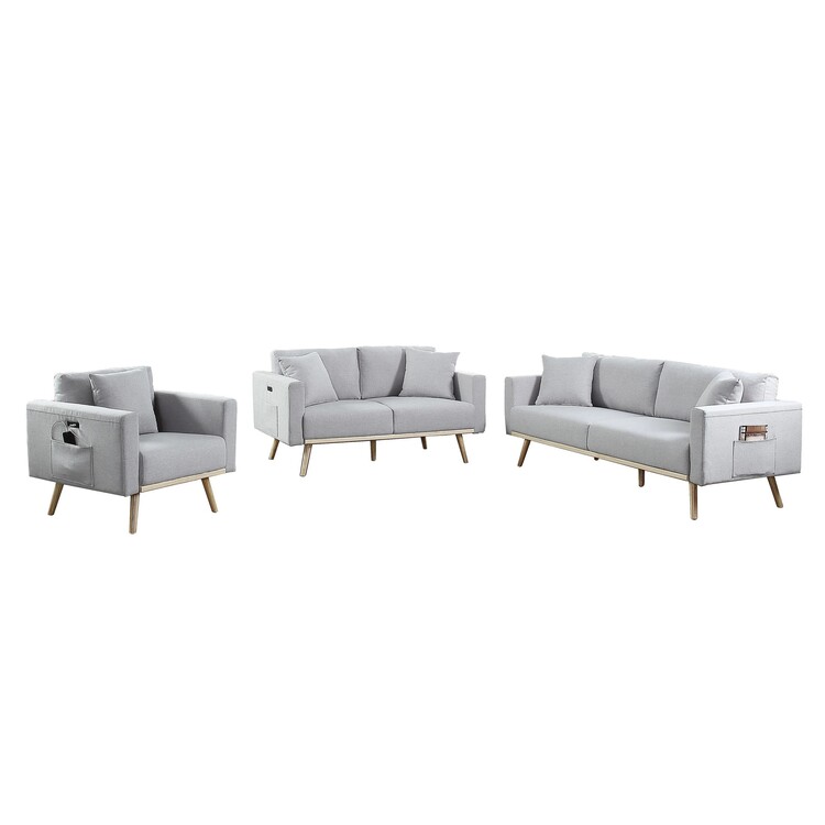 • Benjara Mico 75 Inch Sofa, Loveseat and Chair Set with Throw Pillows, Light Gray image - 1