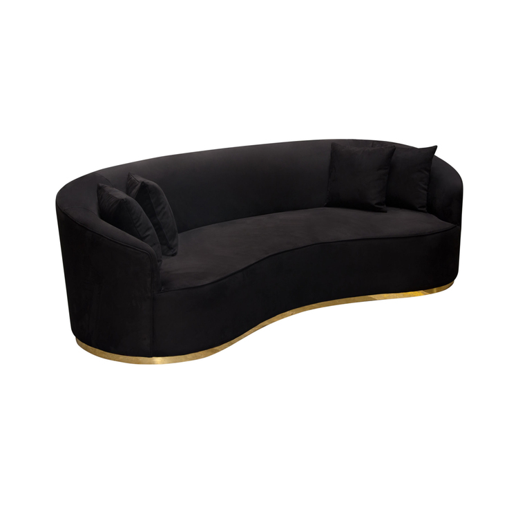 • Benjara Riha Sofa, 97 Inch Retro Curved, 4 Pillows, Black Suede Velvet, Brushed Gold Trim image - 1