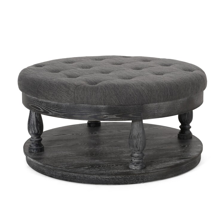 • Benjara Sanya Ottoman Table, Dark Gray Fabric, Black Wood, Round 40 Inch image - 1