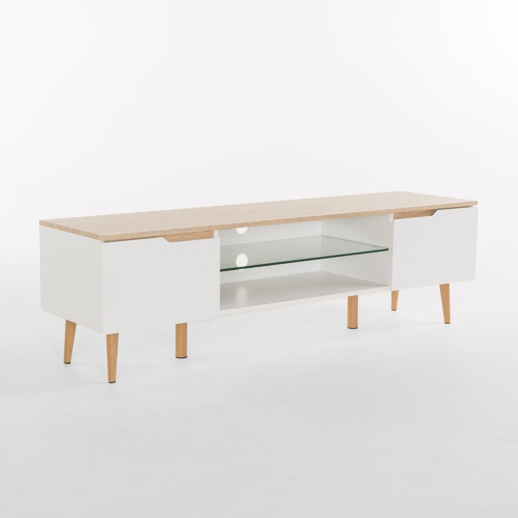 • Benjara Xyna TV Stand Media Cabinet, 2 Doors, Tempered Glass, White, Oak Brown image - 1