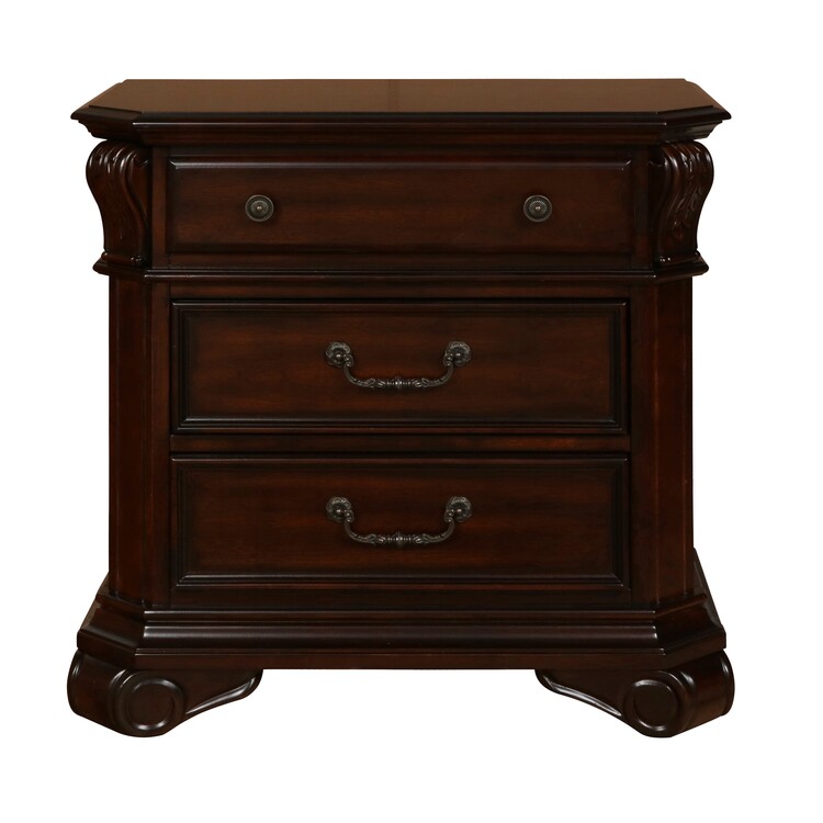 • Benjara Fay 3 Drawer Wooden Nightstand with ed Details and Metal Pulls, Brown image - 1