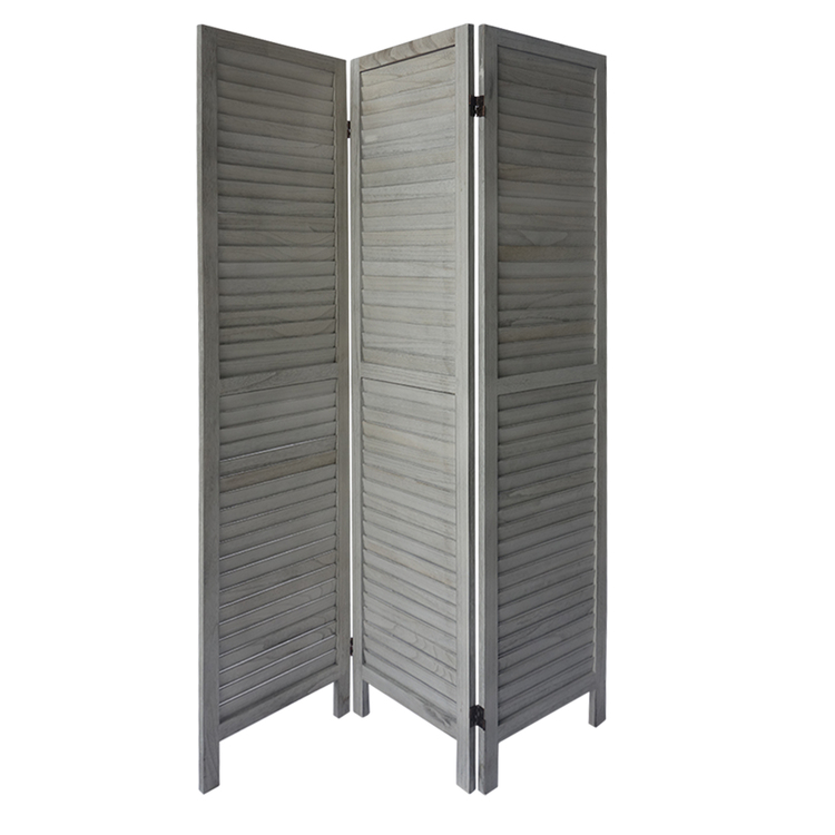 • The Urban Port 67 Inch Paulownia Wood Panel Divider Screen, Shutter Design, 3 Panels, Distressed Gray image - 1