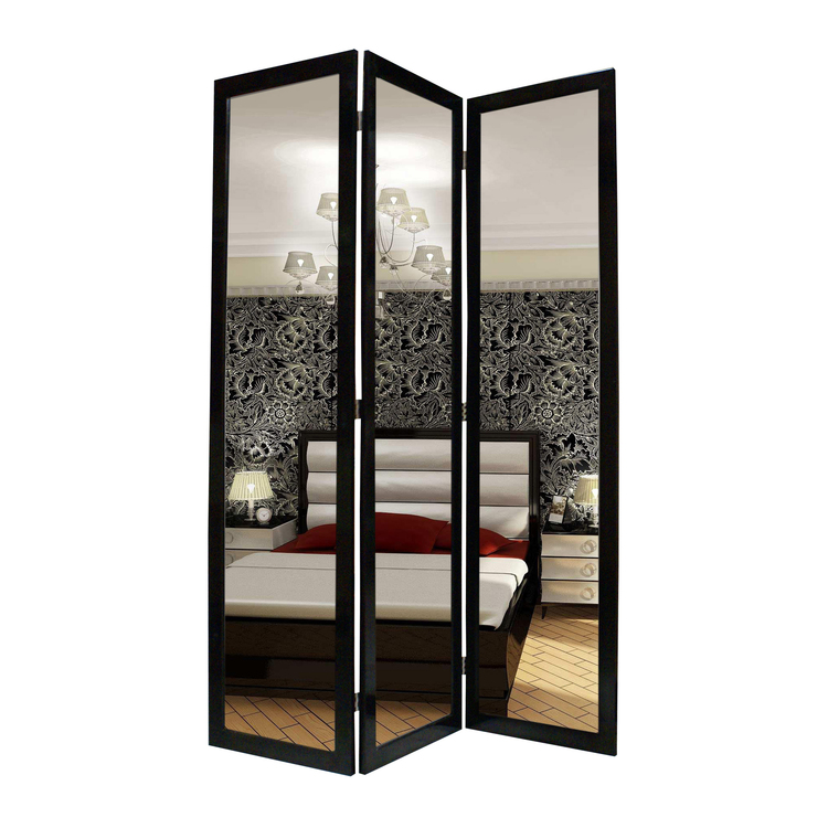 • Benjara 3 Panel Wooden Foldable Mirror Encasing Room Divider, Black and Silver image - 1