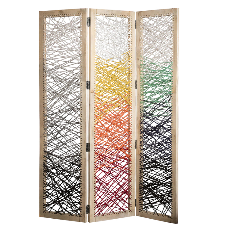 • Benjara 3 Panel Wooden Screen with Woven Reinforced Yarn, Multicolor image - 1