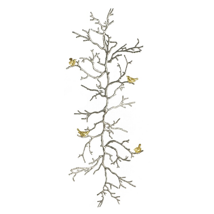 • Benzara Branch Shape Aluminum Wall Decor with Gold Accented Four Birds, Silver image - 1