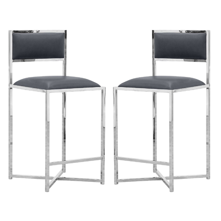 • Benjara Eun 26 Inch Faux Leather Counter Stool, Chrome Base, Set of 2, Dark Gray image - 1