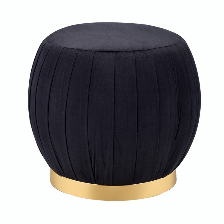 Benjara Fabric Upholstered Round Pleated Ottoman with Metal Base, Black and Gold