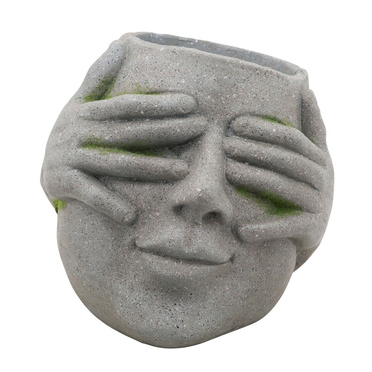 • Benjara Resin Human Head Planter with Hands on Eyes, Gray image - 1