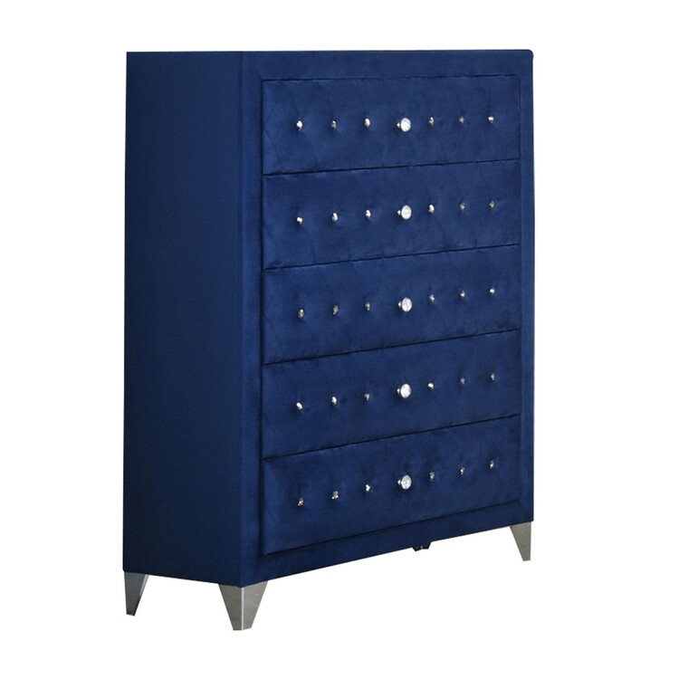 • Benjara Velvet Upholstered 5 Drawer Wooden Chest with Faux Crustal Knobs, Blue image - 1