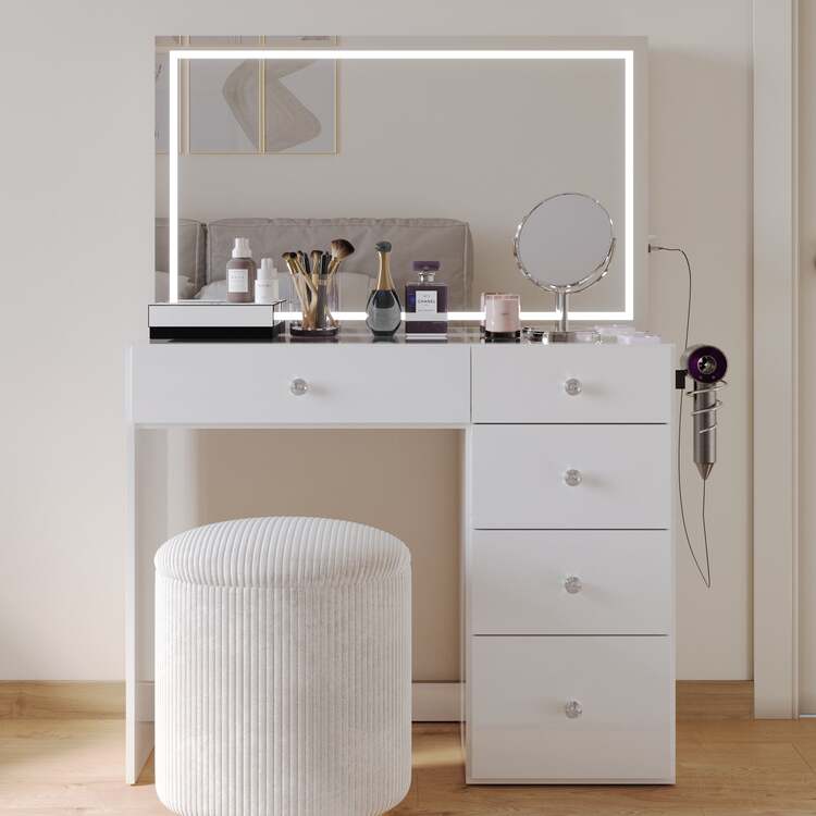 • Boahaus Emilia Premium Makeup Vanity Table with LED Mirror, Bluetooth Speakers, Charging Station, 5 Drawers, Glass Top, Jewelry Divider & Crystal Knobs | 56.61" H x 38" W x 17.32" D image - 1