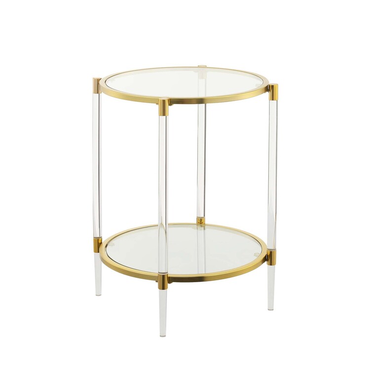 Upgrade your living space to luxury and glam with the Royal Crest 2 Tier Acrylic Glass End Table by Convenience Concepts. Featuring four acrylic legs that support two rose gold chrome metal frames and two tiers of clear tempered glass shelves. Great for entertaining, the spacious tabletop gives you and your guests plenty of table space to place beverages and more. Additional space is available on the 2nd tier of this extravagant end table to showcase your glamourous decorative items. This classy end table is quick to assemble with only 3 easy steps required. Shop coordinating pieces from the complete Royal Crest Collection by Convenience Concepts, each sold separately.