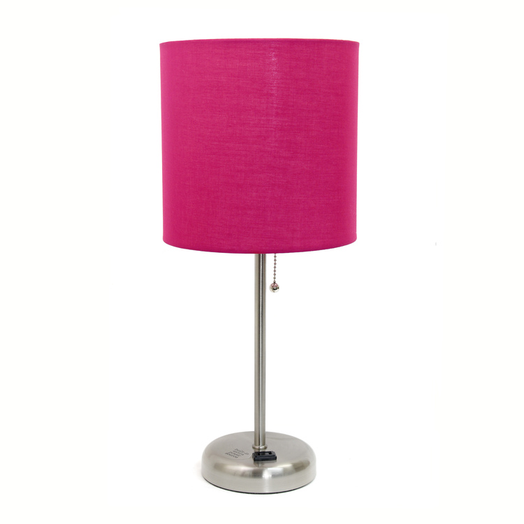 Brushed Steel Bedside Table Lamp with Pink Drum Shade