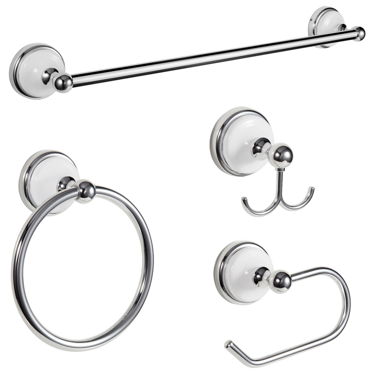 • Design House 188508 Savannah 4-Piece Bathroom Hardware Accessory Kit with Towel Bar, Towel Ring, Toilet Paper Holder, and Robe Hook, Polished Chrome and White image - 1