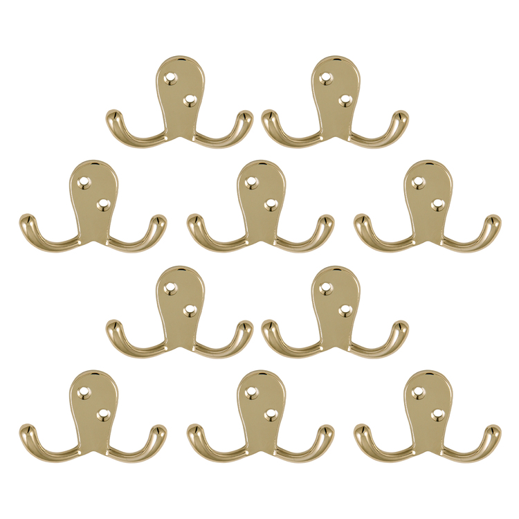 Design House 207753 Wall-Mounted Double Hook for Coat Hat Towel Robe in Bathroom or Closet Polished Brass 10-Pack