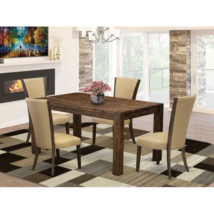 • Dining Room Set 5-Pc Brown Linen Chair Distressed Jacobean Table image - 1