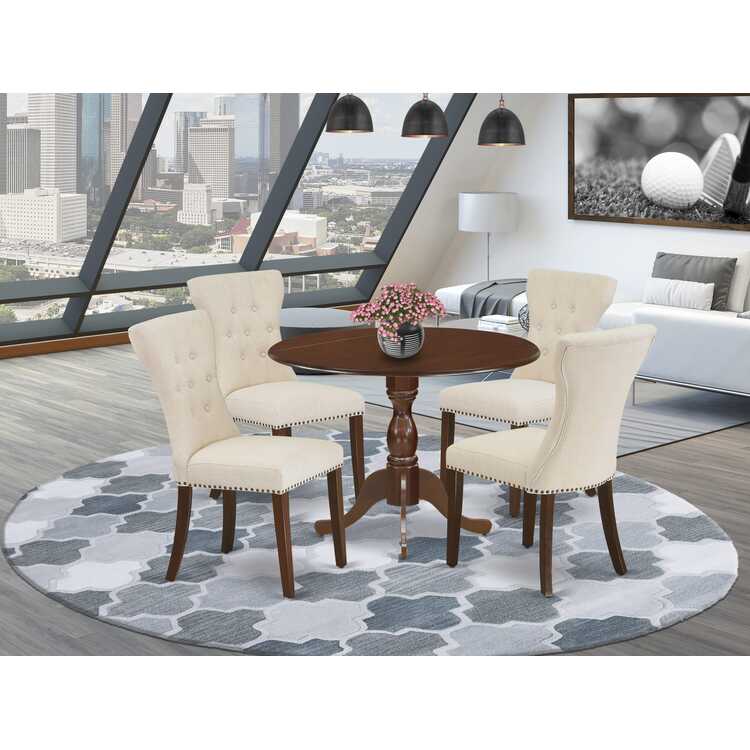 • Mahogany Small Kitchen Table & Light Tan Linen Fabric Chairs Set image - 1