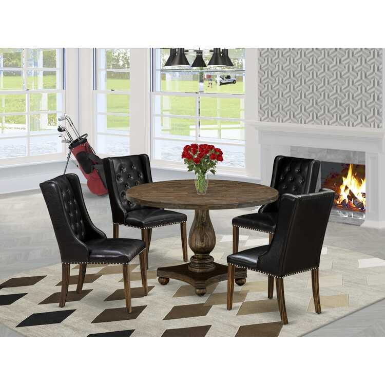 • Mid Century Dining Set Distressed Jacobean Wood Table Leather Chairs image - 1