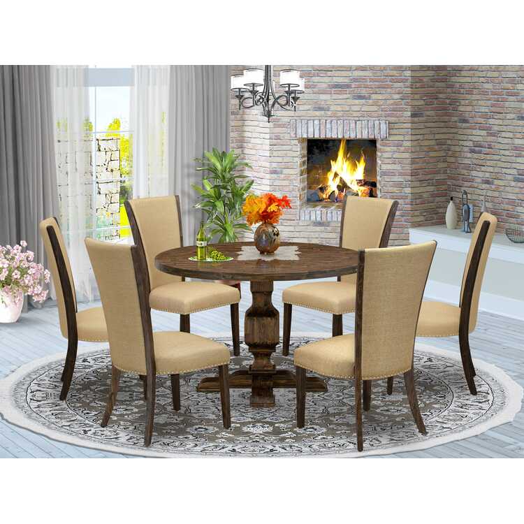 • 7-Piece Kitchen Table Set with Linen Chairs - Distressed Jacobean Finish image - 1