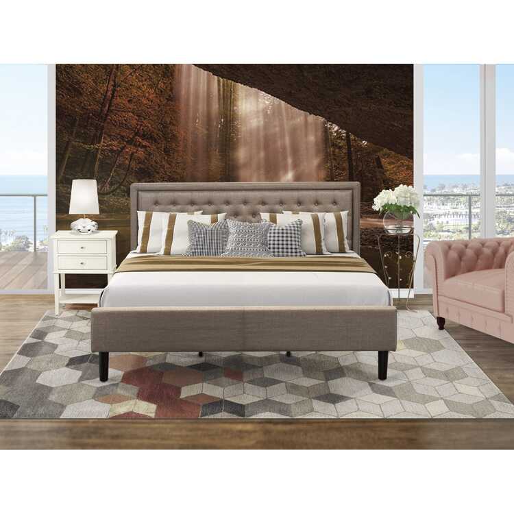 Dark Khaki Linen Fabric Bed Set with Wooden Frame and Nightstand