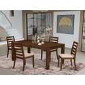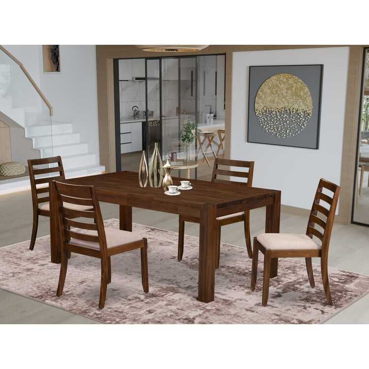 East West Furniture LMX15-0N-04 5-piece Kitchen Table set included a Rectangular Kitchen Table and 4 Light Tan Linen Fabric stackable Chair, Antique Walnut Finish.