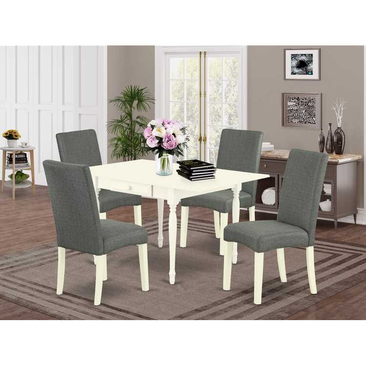 • Gray Linen Parsons Dinette Set Small Space Kitchen Table 5Pc Chair Drop Leaf Table image - 1
