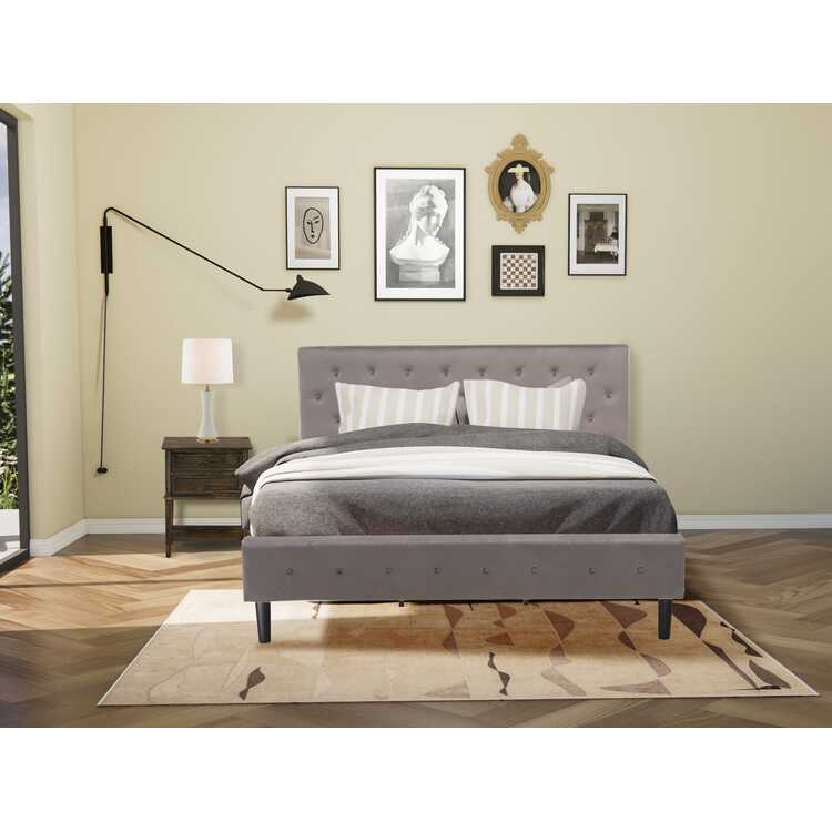 • East West Furniture NL14K-1VL07 2 Piece Bedroom Set - Button Tufted Modern Bed - Brown Taupe Velvet Fabric Upholstered Headboard and a Distressed Jacobean Finish Nightstand image - 1