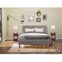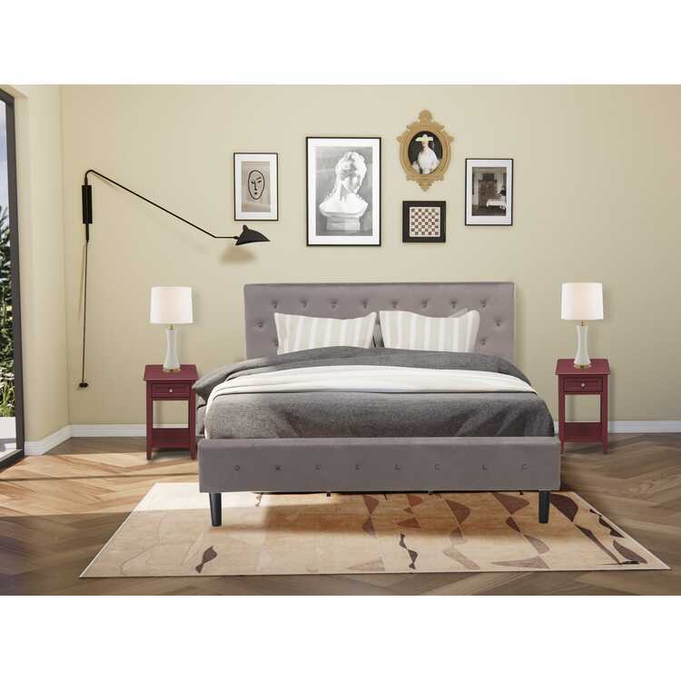 • East West Furniture NL14K-2DE13 3 Piece Bed Set - King Size Button Tufted Platform Bed - Brown Taupe Velvet Fabric Upholstered Headboard and a Burgundy Finish Nightstand image - 1