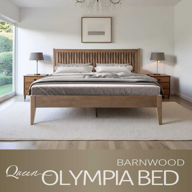 • East West Furniture Queen Size Bed Frame with Headboard & Footboard Solid Wood Platform Bed, Metal Legs, 12 Sturdy Slatted Structure, No Box Spring Needed, Anti-Noise & Slip-Free, Easy Assembly, Barnwood Finish, OLQ-30 image - 1