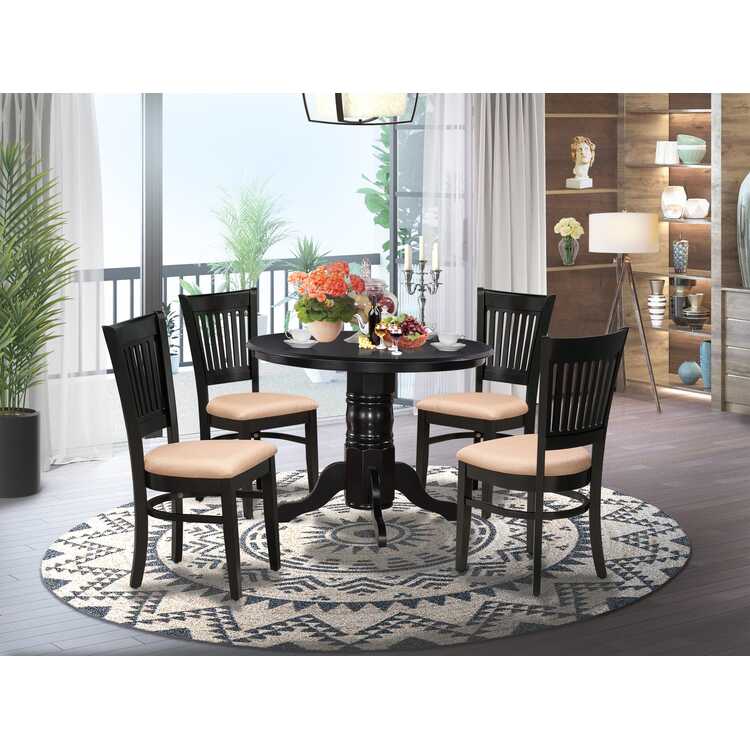 • Modern Kitchen Dining Set Black Linen Chairs Round Table 5-Piece image - 1