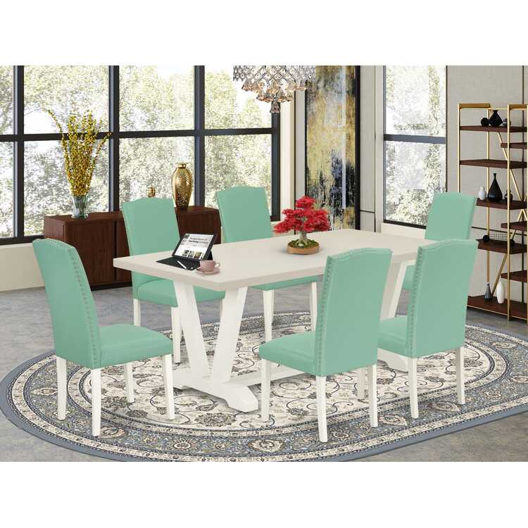 • Mid Century Dining Set - Table & 6 Chairs - Linen White & Pond image - 1