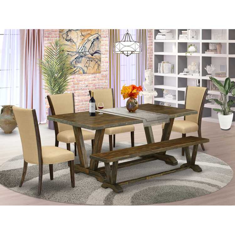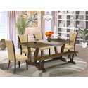 • Brown Linen Fabric Dining Set Jacobean Style Distressed Wood Table Bench image - 1