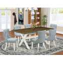 • 7 Piece Dining Set - Baby Blue Linen Fabric Chairs & Table image - 1
