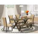 • Dining Table Set Brown Linen Chairs Jacobean Distressed Wood Bench image - 1