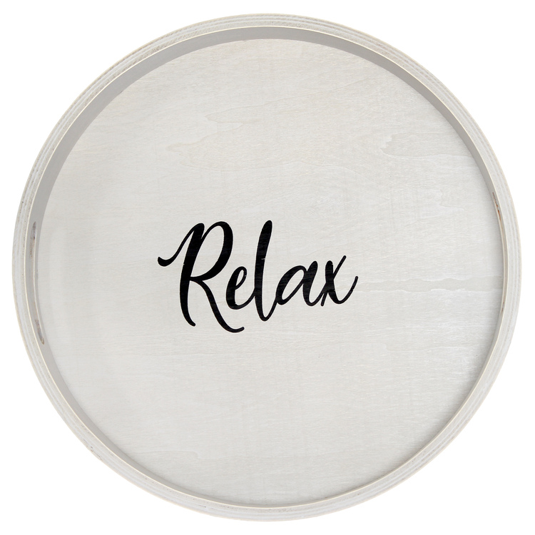 Elegant Designs Decorative 13.75" Round Wood Serving Tray w/ Handles, "Relax"