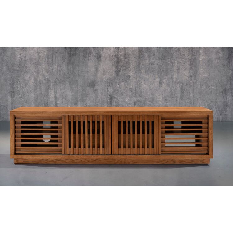 • Rustic Contemporary TV Media Console, Honey Finish, Oak Case, 4 Slatted Cherry Doors - Furnitech image - 1