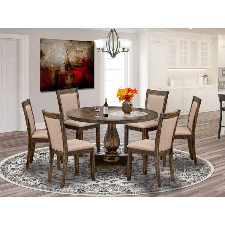 • East West Furniture I2MZ7-716 7 Piece Modern Dining Table Set Consist of a Round Wooden Table with Pedestal and 6 Dark Khaki Linen Fabric Upholstered Chairs, 48x48 Inch, Distressed Jacobean image - 1