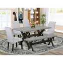 • X696BA105-6 6 Pc Dinner Table Set Consists of a Cement Dining Table and a Dinning Bench, 4 Grey Linen Fabric Upholstered Dining Chairs with High Back - Wire Brushed Black Finish image - 1