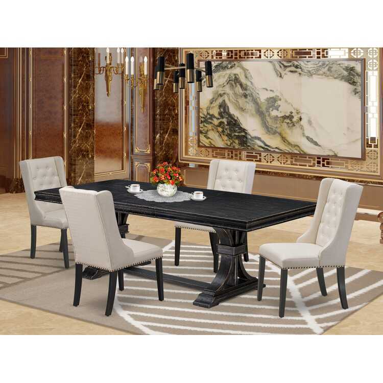 • HomeStock African Artistry 5 piece kitchen table set includes a dinner table and 4 Cream Linen Fabric dining chairs with Button Tufted Chair Back Sand Blasting Black. image - 1