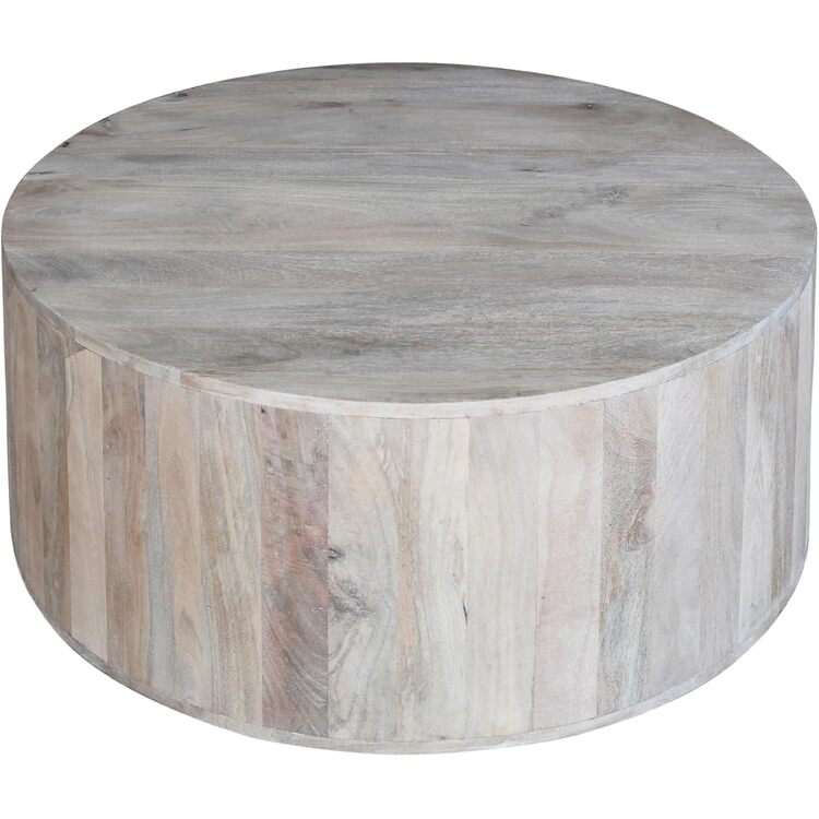 • HomeStock Antique Appeal Drum Shape Coffee Table 36" x 36" x 17" in Washed White Mango Wood Featuring Classic Round Top and Vintage Wood Grain Details image - 1